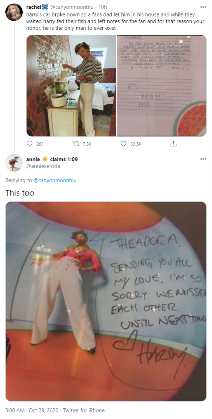 Not only he stayed over at her house, but Harry also helped her feed her fish and left a note because the said fan, whose name is Theodora, was not at home when he dropped by. The note read, "Theodora, my car broke down on your street and your dad's friend kindly let me wait at your house with a cup of tea. I'm devastated that we missed each other. Looking forward to meeting you soon."